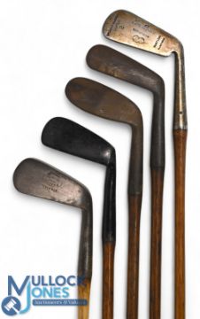 5x Assorted golf irons to incl Tom Brace patent hosel blade super 2 iron, W Hunter ridged back deep faced round topped mashie with Lion cleek mark, Tom Stewart wide soled mashie for H Allen of York and F Warburton dished faced iron and an off set mashie for Robinson of Bradford showing the three crown cleek marks to the toe - all fitted with full length grips