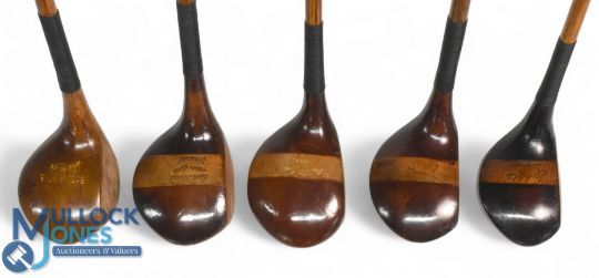 5x Assorted socket neck woods incl Jack White autograph stripe top spoon, Fred Stephens stripe top large head driver, JH Taylor autograph small head spoon, Hugh Roberts Stoke Poges stripe top driver and a C Macklevenny stripe top brassie - all fitted with full length grips