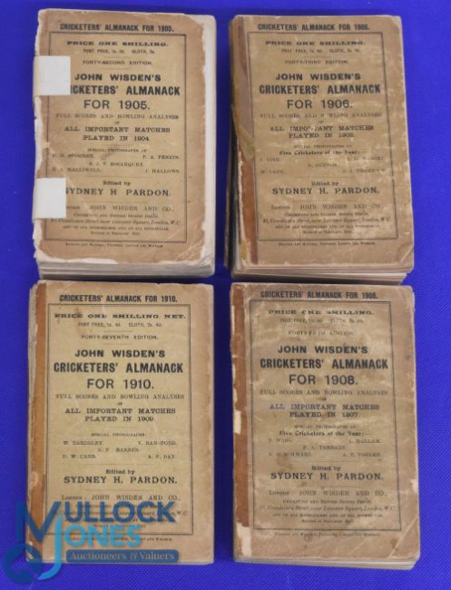 Four John Wisden's Cricketers Almanack's 1905, 1906, 1908 and 1910 All are original in a modern box - Mixed condition with all having worn spine, tape repairs, tears edge, marks.