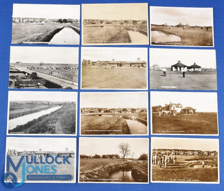 Good collection of 20th c Carnoustie b&w golfing postcards (12) many featuring players, spectators, and various views of the old golf course to include Starters Box, 1st tee, 10th Green, 16th Hole (from 1953 Open Golf Championship), 18th Green, Barry Burn - 4x used dates include 1934, 1936, 1937 and 1969 - including Valentines, J B White Dundee, Caledonia Series, E T W Dennis & Sons