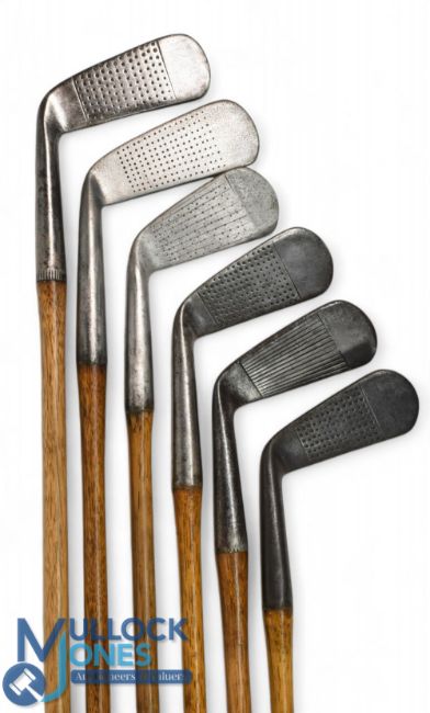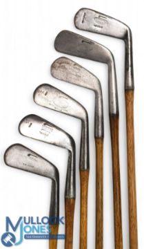 6x Assorted Tom Stewart irons features a no 2 iron for Alex Philips, no 3 iron stamped A Crook, mid iron, mashie and 2 straight blade putters, one with the makers St Andrews mark and the other stamped Albert Whiting of Folkstone - all with grips