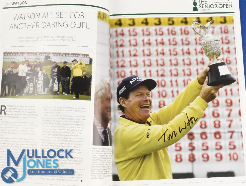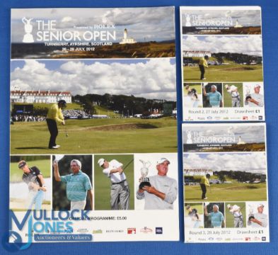 2012 Turnberry Senior Open Golf Championship signed programme - signed by 15x Major and PGA Tour winners Tony Jacklin, Tom Watson, Fred Couples (winner), Bernhard Lange, Loren Roberts, Mark Calcavecchia, Michael Allen, Jay Haas, Tom Kite, Tom Lehman, Greg Norman, Larry Mize, Sam Torrance, Carl Mason, and Gary Wolstenholme plus 2x draw sheets for the 2nd and 3rd rounds