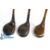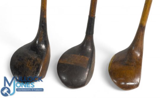 3x Socket neck woods to incl Simpson Gold Medal driver with brass backweight, Frank Bennett Oakwood Park Conwy dark stained persimmon driver and a Fred Jarman stripe topped brassie with central black fibre insert - all with full length grips