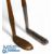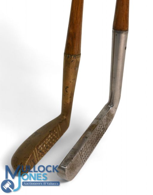 2x Interesting putters features a very shallow elongated broad head metal blade showing the Spalding Anvil mark, t/w a Brown/Vardon styled brass head with deep punch dot face markings showing the Halley crossed sword mark to the crown