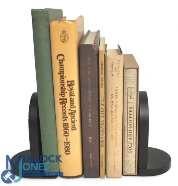 Golf Books: To include Cleek Marks and Trademarks on Antique Golf Clubs, Golf and Golfers USGA, American Golf Club Marks 1898-1930, Natural Golf John Duncan Dunn, The Scrapbook of Old Tom Morris, Royal and Ancient Championship Records 1860-1980 (box)