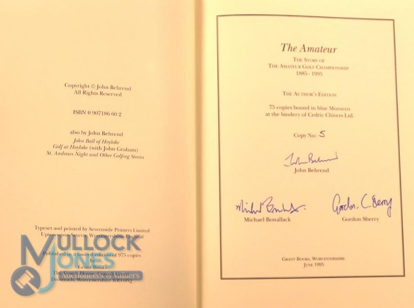 The Amateur - Behrend, John, Droitwich, Worcestershire: Grant Books, 1995 - 255p, leather, slipcase, statistics by John Littlewood, and appreciation of Bobby Jones by Charlie Yates. 5/75 limited edition, signed by John Behrend, Michael Bonallack, Gordon Sherry - the preferred edition, hard to locate