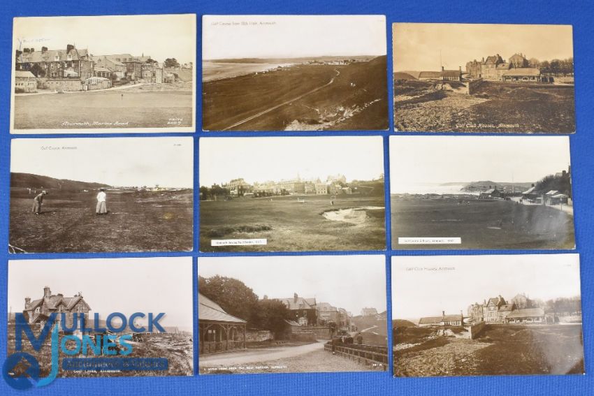 Collection of early 20th c Alnmouth Village Golf Links b&w postcards (9) mostly real photographs of the clubhouse, golf course and beach, No. 1 Bunker, 15th Hole, Edwardian lady golfers - 5x used dates ranging from 1913 to 1930 - Frith Series, Valentines, Graham and Henderson Alnmouth, R Johnston & Son Gateshead, Reliable Series, The Monarch Series, John Earl Alnmouth et al
