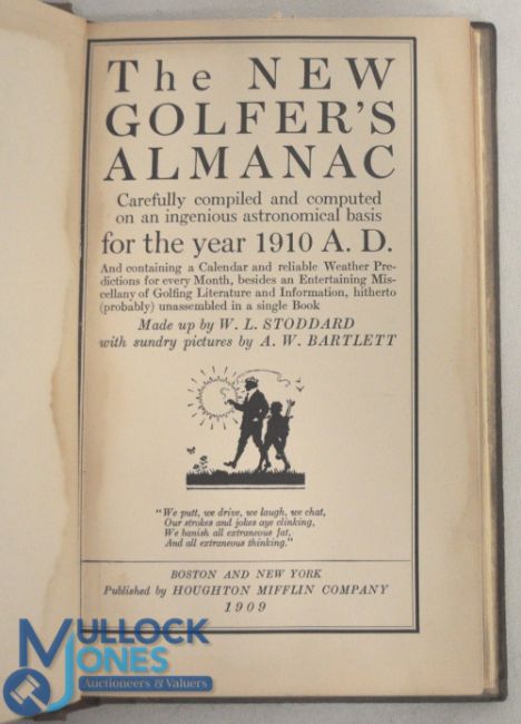 The New Golfer's Almanac for the Year 1910 Stoddard, W L published by Houghton Mifflin, Boston, 1909 8vo. A gorgeous 1909 1st Edition. Illustrations and cover art by A W Bartlett. Features a miscellany of golf literature, poetry, a history of the game as well as tips, weather predictions for the upcoming year, and other advice for turn of the century golfers. 90pp (note new inside covers and spine)