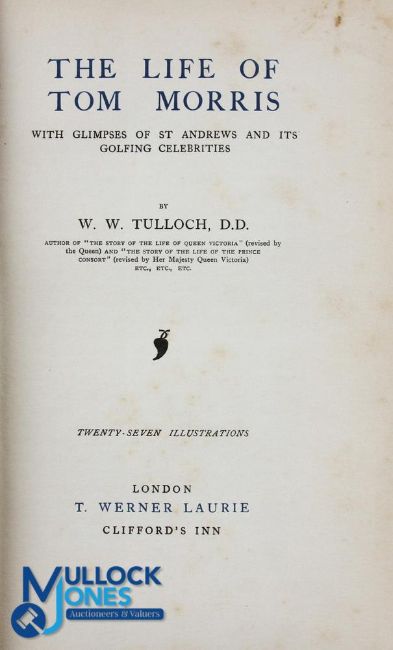 Tulloch, W W - The Life of Tom Morris 1st ed 1908 publ'd T Werner Laurie, London, 334pp, decorative cloth boards, has signs of front-end page reglued - some fading/rub marks to covers, light speckled foxing in places otherwise internally clean F/G
