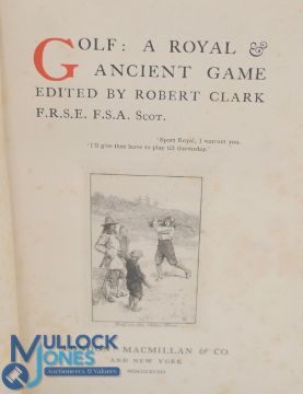 Golf: A Royal and Ancient Game: Clark, Robert. London: MacMillian & Co, 1893 305p. Green boards, top edges gilt. Second Edition, preceded by the 1st Edition of 1875 "Widely regarded as one of the most significant, as well as best produced, early books on the history of golf, Clark's work is a compilation of the earliest literature of the game." Robert Clark put a groundbreaking masterpiece together compiling in one volume all the significant golfing works previously published. Cundell's Historic account of the game. Mathison's Goff etc a true classic. Cornerstone to any Library. Presented to J J Anderson Esq with the Editors Compliments November 13th, 1893. Some wear to spine
