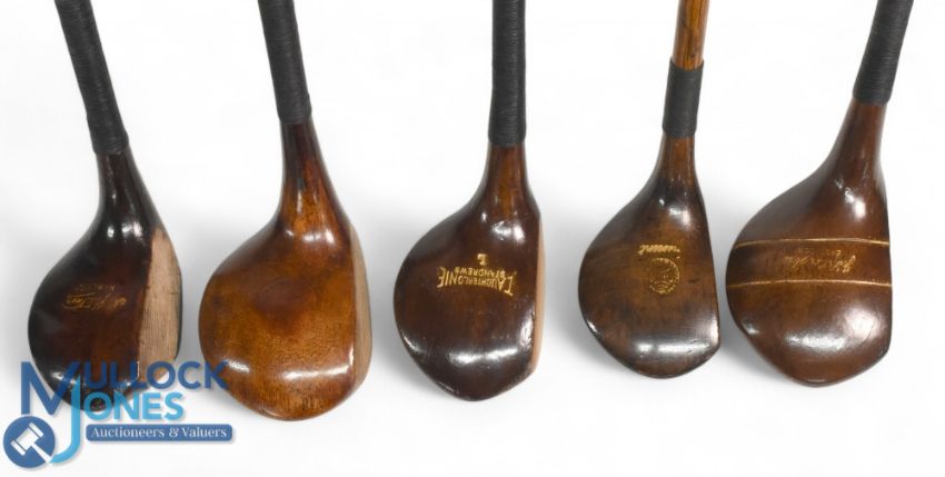 5x Assorted socket neck woods a large head shallow face driver stamped Simpson St Andrews, brown stained driver stripe top JL Douglas of Eastwood, M Walker of Harlick small headed brassie, a similar stamped with the Spalding Baseball mark and crescent to the crown t/w a T Auchterlonie St Andrews Ladies brown stained driver - all with grips