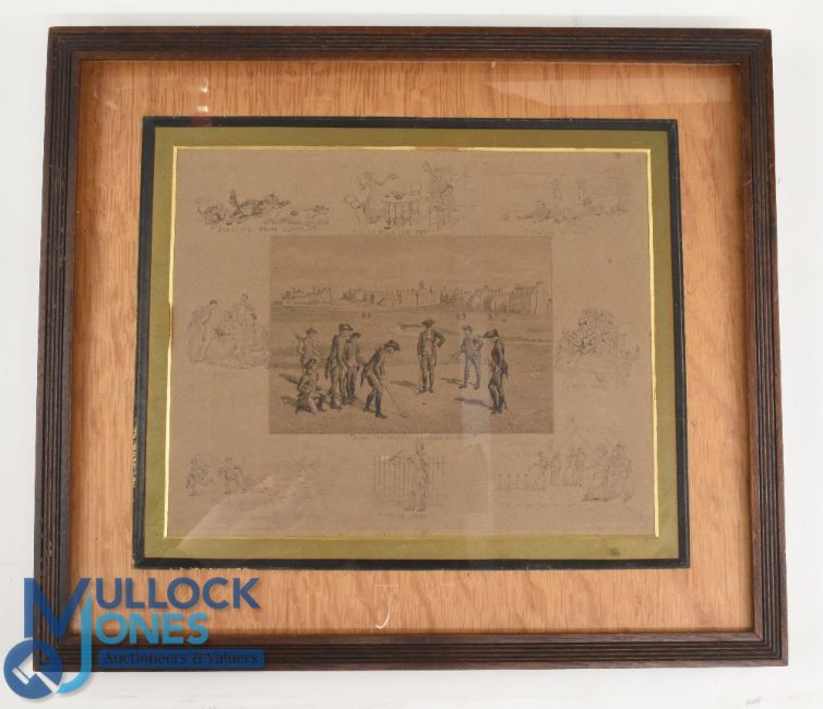 Frank Paton (1856-1909) engraved golf print of a match on the links St Andrews titled "Royal and Ancient (St Andrew, 1798) together with 8 numerous sketches surrounding the scene on the signed print - mf&g with gilt slips overall 13.5 x 15.5"