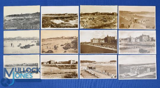 Interesting collection of various early 20thc St Andrew Golf Links b&w postcards (12) mostly real photographs to include The Putting green, the R&A Golf Club House, views of St Andrews and the golf course from West Sands, The Golf Club and Grand Hotel, for the other featuring the vintage motor vehicle with holidaymakers in the background - 5x used dates ranging from 1929 up to the 50s and 60s - including Dennis Productions, E T W Dennis & Sons, Valentines