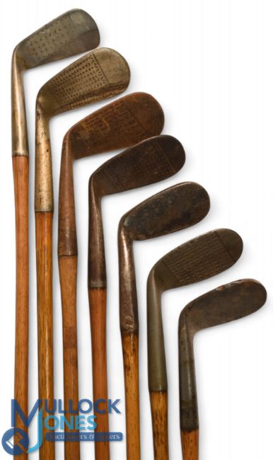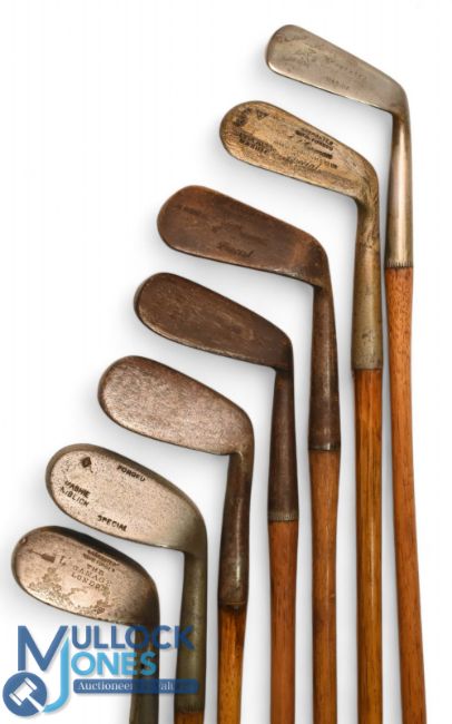 7x Various irons to incl Winton round toed shallow mashie niblick, J Bremner deep faced mashie, Zenith deep faced mashie stamped J Jarman, Spalding Anvil mashie niblick, unnamed niblick t/w a ladies niblick stamped the Gamage London - 6x gripped