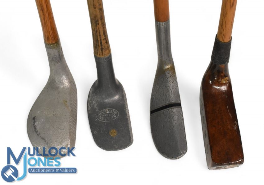 3x Alloy mallet head putters the Maxim patent with very drop toe and rounded sole, a triple X model with inlaid central aiming line, a modified model stamped AG Head with faint hosel crack, t/w rectangular persimmon putter with numerous lead weights and brass sole plate - all fitted with full length grips