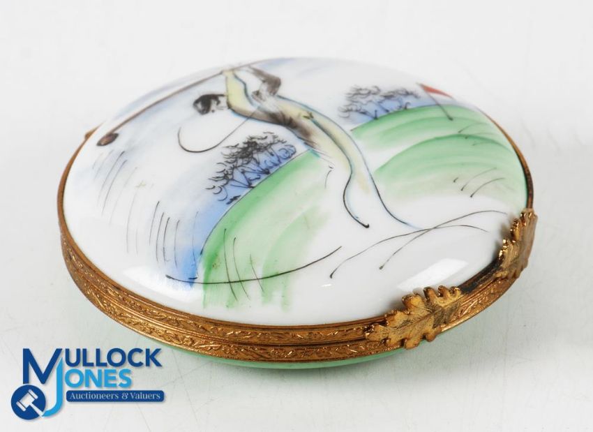 Limoges Round Box with golfer Design with gilt colour metal edges and clasp, hand written makers marks to inside, width 6cm
