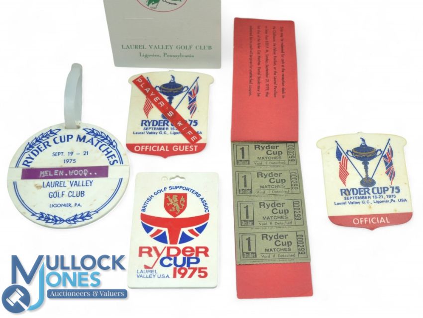 1975 Ryder Cup Norman Wood Official Issued Badges: To Consist of Players Badge, scarce Red Ticket book containing 4 mint $1 Dollar admission tickets, Mrs Helen Woods Official Guest Badge and Bag tag, Hugh Wood Bag tag and relative of Norman together with a unused score card, 1975 World Cup Bangkok Thailand Diploma