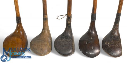 5x Various socket neck woods - a large head brassie stamped R Kelly Norwich in light stained persimmon, Gibson of Kinghorn small head driver with some external damage, and a T Auchterlonie very deep faced round sole lofted wood, t/w 2x spoons one stamped A Hancock - 4x fitted with grips