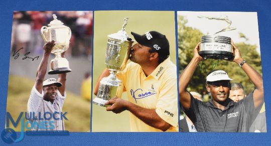 Collection of Overseas Golf Players Major and Tour Winners signed press colour photographs to incl 2x Vijay Singh (USPGA Champion 1998 and 2004) and winner of The Buick Open in 1993; and Angel Cabrera 2007 US Open winner - each with their trophies