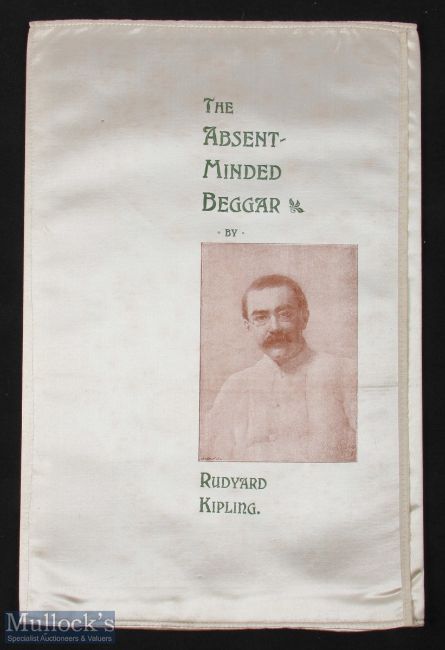 "Lily Langtry" The Absent Minded Beggar Boer War Souvenir Charity Item on Silk 1899 - Entitled "The Absent Minded Beggar by Rudyard Kipling". With centre illustration of "A gentleman in khaki" words of the song and poem. On reverse portrait of Rudyard Kipling and text "This souvenir is presented by Mrs Langtry on the occasion of the 100th Performance of the Degenerates at the Garrick Theatre for permission to use Mr Kipling's poem. Mrs Langtry made to the "Daily Mail" a contribution of £100 for the benefit of the wives and children of the reservists fighting in South Africa". Large printing in green and brown on fine quality Silk, folds out to large size of 23" x 12"