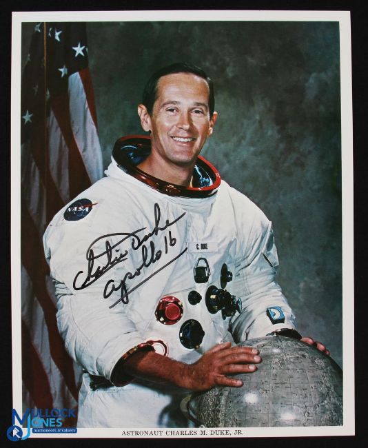 NASA -Autograph - Eugene Cernan colour 8x10 showing the crew of Apollo 11 signed by Cernan in lighter portion of the image, plus a NASA - Jim Irwin - Apollo 15 colour 10x8 showing Irwin on the moon, signed in a lighter portion of the image. NASA - Charles Duke - Apollo 16 - colour 10x8 showing Duke seated in space suit signed across the image, plus Fred Haise - Apollo 13 colour 10x8 showing him seated in space suit signed across the image