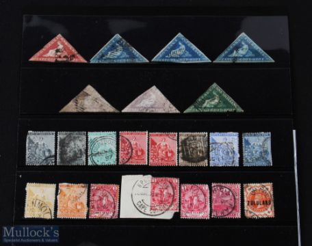 South Australia; Collection of 38 Postage Stamps 1850s-1900s. Some early imperfs. Japan - Collection of 85 Postage Stamps 1870s-1910s. A quite interesting early selection. Rhodesia & Nyasaland - Collection of 13 Stamps and Post Card 1890s-1910. All British South Africa and Central Africa Companies stamps, including a £5 Stamp at shown at top centre. South Africa - Cape Colony: early collection of 22 Postage Stamps 1850s-1900s, interesting collection including 7 early Triangle stamps, the first of that shape issued. Argentina - Collection of 15 Postage Stamps. 1862-1890s. Interesting early issues