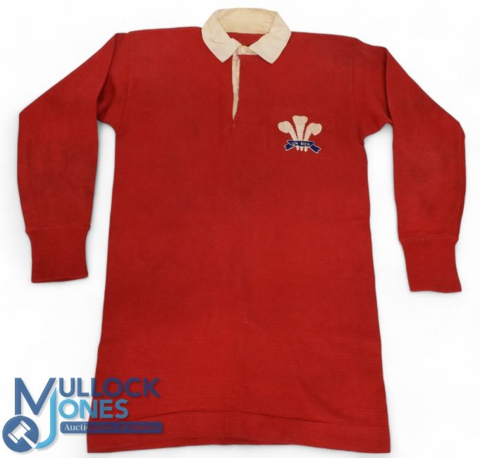 c1930s Wales Schoolboys Match worn Rugby Jersey: Lovely clean, cared-for example, scarlet with the classic old three feathers badge and black no.8 on white stitched patch to rear. Splendid chance
