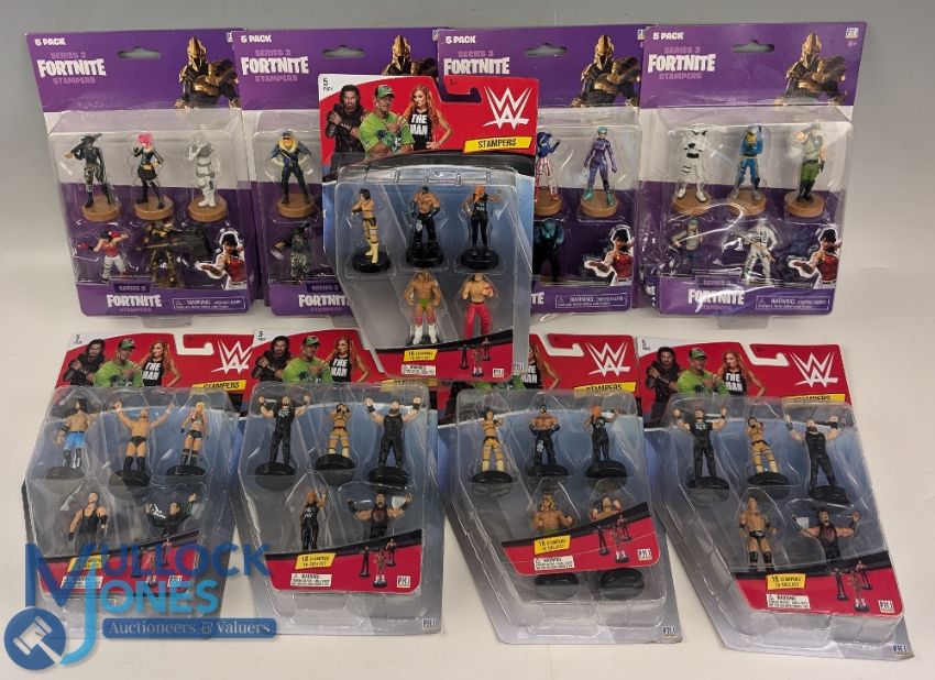 WWE Wrestling Stampers and Fortnite Series 3 Stampers, a collection of carded 9 packets, one having damage to blister card (9)