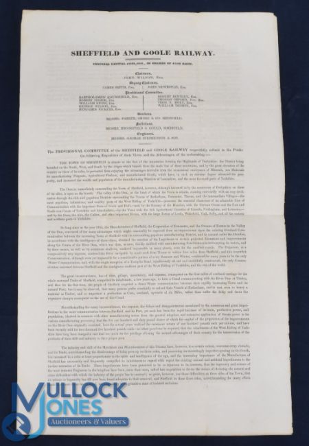 Railways - An Early Intended Sheffield and Goole Railway Prospectus 1830 - 4 page Prospectus with Map extensively detailing the advantages of this intended railway and additional trade both merchandise and passengers. Mentioning the engineers are George Stevenson & Son. Detailed black printing, size 9 1/2" x 15 1/4"