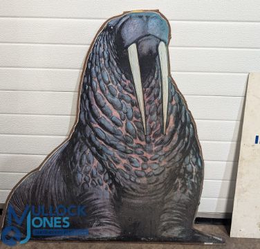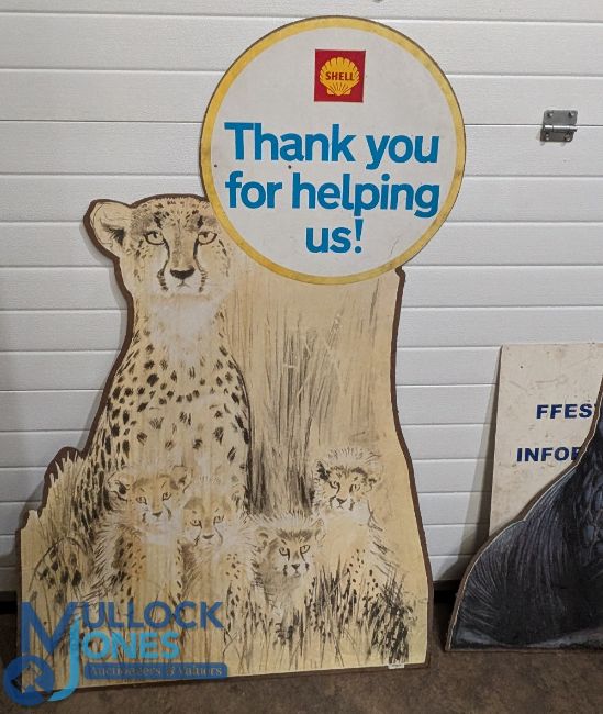 C1970 Shell Advert Signs 'Thanks for Helping Us', Wild Life Charity posters, 2 large posters stick on plyboard, a Leopard and Walrus (missing its top) - plus a First Hydro Ffestiniog power station information sign. Large items collection recommended (3)