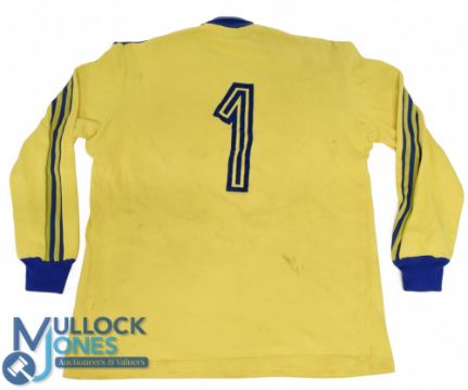 c1980s/90s Trio of Romanian Match worn/Prepared Rugby Jerseys (3): What a find: that distinctive Romanian yellow, three different issues. All Adidas made in France, two from the pre 1989 Ceausescu era with identical badges and same blue-striped sleeves, but one with a red 18 to rear, the other a blue no.1, with blue collar and cuffs. Most modern has red 13, FFR oakleaf badge and the blue arm stripes. VG