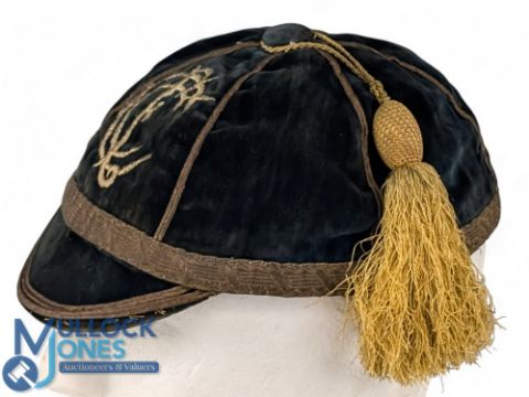 1890s? Crompton FC, Oldham Rugby Honours Cap: Carrying considerable age, good to outer but grubby from wear within, a nice blue and gold braided, monogrammed and tasselled example from this defunct outfit near Manchester in the late 19th and early 20th centuries. JC Stewart make, and named within to Wolstencroft. Interesting lot