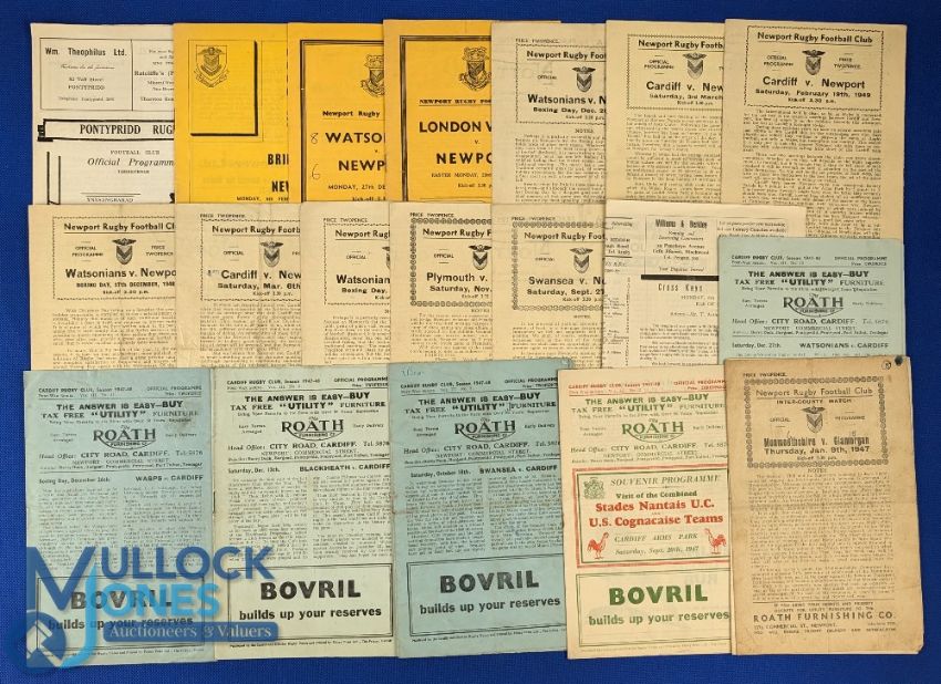 1947-71 Welsh Club & County Rugby Programme Pot-Pourri (c.20): Mon v Glam & return 1947; five Cardiff inc v Nantes/Cognac 1947-8; Newport, 8 from 1947-51, two from 60s and one 1971; and both Cross Keys & Pontypridd v Neath, 1967. Mixed, bargain?