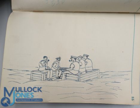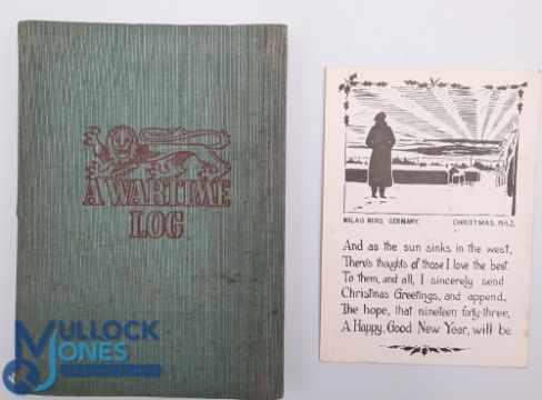 WWII Prisoner of War Wartime Log Book and Christmas 1942 Postcard; the wartime log book has sketches by R Hill of his manoeuvres, MV Glenorchy merchant ship, prisoner of war camp, 8 sketches in total, a few pages of addresses to back of book otherwise empty, plus 1942 Milag Nord Germany prisoner of war postcard, unused