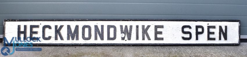Period Heckmondwike painted wooden Railway Signal Box Station Sign, a good heavy sign with raised wooden lettering Yorkshire-Bradford area - size #27cm x 240cm. Collection Only