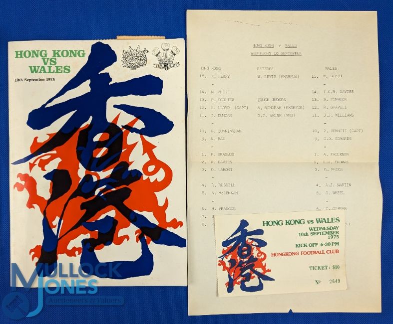 1975 Hong Kong v Wales Rugby Programme: The famously attractive cover on a large issue for the game starting the Far East Tour nearly 50 years ago. With several foreign press cuttings. VG