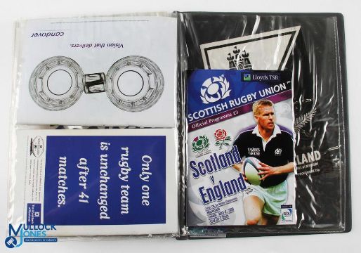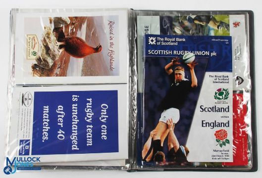 Scottish Rugby Programmes etc (22): v England 1988, 90, 96, 98 & 2000; v France 1994 & 96; Wales 1991 & 95; v Ireland 1995; v NZ 1993; v W Samoa 1995; v Barbarians 1996 & v England, RWC Semi-final, 1991; Ireland v Scotland 1990; Wales v Scotland 1998; RWC Sevens 1993; Varsity Match 1998; & three guest/entry badges/passes for the St Andrews Open Golf, 1995. Generally, G