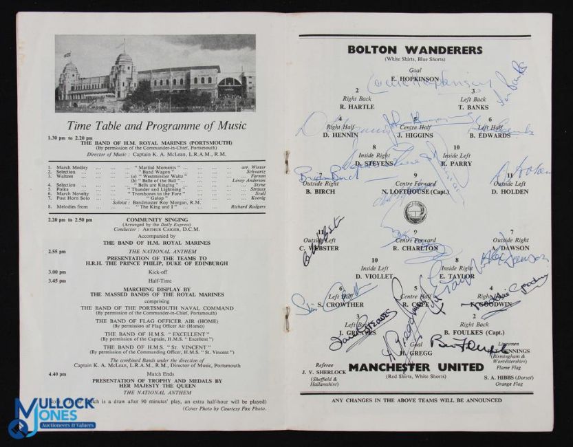 1958 Bobby Charlton 1st Wembley match after Munich, FAC Final 3 May 1958 match programme Manchester United v Bolton Wanderers autographed by both teams: Manchester Utd: Bobby Charlton, Harry Gregg, Bill Foulkes, Freddie Goodwin, Ronnie Cope, Ian Greaves, Stan Crowther, Alex Dawson, Colin Webster, Ernie Taylor; Bolton Wanderers: Nat Lofthouse, Eddie Hopkinson, Tommy Banks, John Higgins, Derek Hennin, Bryan Edwards, Ray Parry, Doug Holden, Dennis Stevens, Brian Birch; unique item from those early "United will go on" (and they did!) post disaster days. (1)