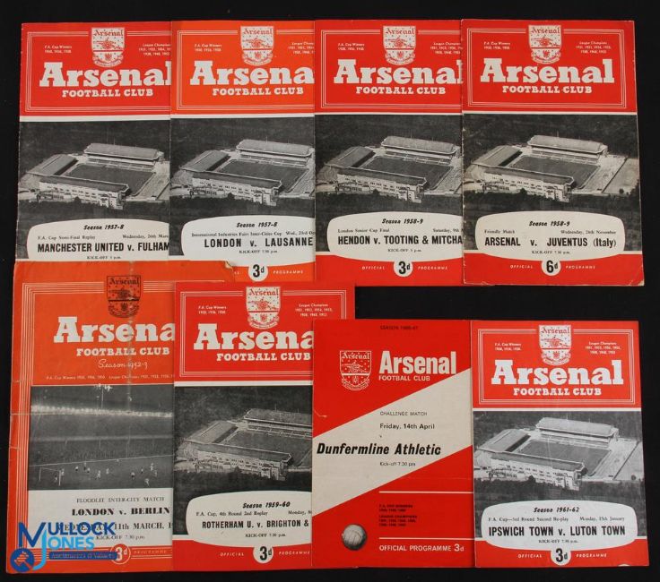 Match programmes at Highbury; 1953 London v Berlin (Inter-City), 1957/58 Manchester Utd v Fulham FAC s/f replay, 1957/58 London v Lausanne (Inter-Cities Fairs Cup), 1958/59 Hendon v Tooting & Mitcham (London Snr Cup Final), 1958/59 Arsenal v Juventus (friendly), 1959/60 Rotherham Utd v Brighton & HA (FAC 2nd replay), 1961/62 Ipswich Town v Luton Town (FAC 2nd replay), 1966/67 Arsenal v Dunfermline (friendly); fair. (8)