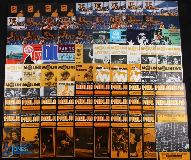 Collection of Wolverhampton Wanderers match programmes 1973/74 homes including WBA (friendly), OS Belenenses (UEFA) (20): aways including FLC final v Manchester City (4): 1974/75 homes including Porto (UEFA) (24), aways (8): 1975/76 homes including Liverpool (championship decider), WBA (FAYC final) (27), aways (7); 1976/77 homes including Manchester City centenary match (24), aways (3); overall fair. (117)