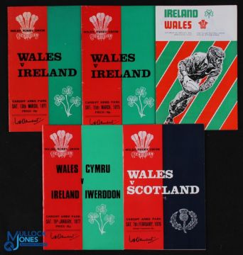 1971-77 Wales Rugby Programmes v Ireland & Scotland (5): Cardiff issues v Ireland 1971 (Wales Grand Slam), 1975 & 1977 and v Scotland 1976, plus Ireland v Wales 1976 (both Wales Grand Slam). Excellent