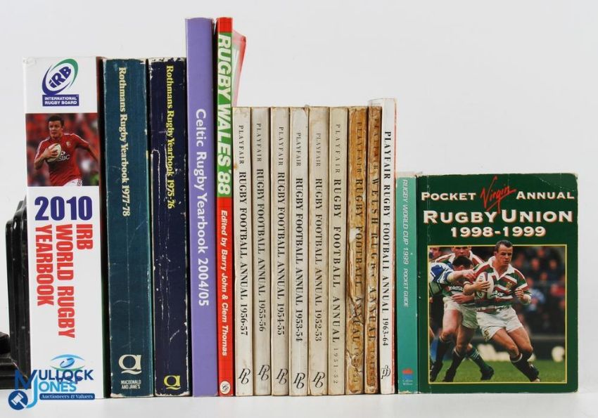 1949-2010 Rugby Annuals, Yearbooks etc (16): Playfairs 1949-50 (only Wales edition), 1950-57 inc & 63-4; Rothmans 75-6 & 77-8; IRB 2010; Rugby Wales, B John & C Thomas, 88; Virgin Pocket Rugby Annual, 88-9; RWC Pocket Guide, 99 & Celtic League Yearbook 2004-5. G/VG