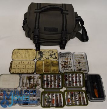 Collection of 8 fly boxes comprising a Hardy black japanned 15 compartment box, hinged lids, washable plate and tweezers, a Hardy Mayfly box with flies, 3 x Wheatley alloy boxes, 2 dry fly, 1 swing compartment, 2 x Wheatley green pocket fly boxes with dry/wet flies' selection, a Wychwood Vuefinder box, all held in a Cobra padded case.