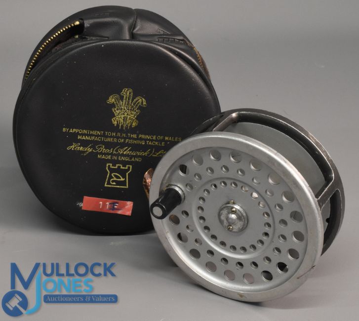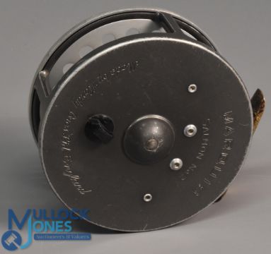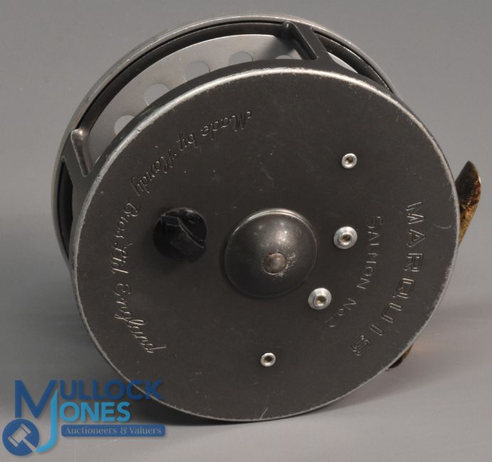Hardy Bros "Marquis Salmon No 2" alloy fly reel 4 1/8" ventilated spool, 2 screw latch, black handle, rear tensioner, constant check, ribbed brass foot, MZC (light rim wear). Runs very well