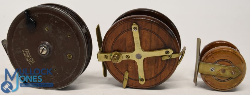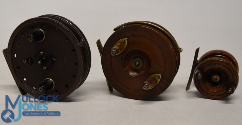 A collection of centre pin reels, as follows: Milward Floatcraft trotting reel, 4" narrow shallow ventilated spool, 2 screw latch, twin handles, milled face plate tensioner, on/off check. Light use, runs well. Unnamed mahogany and brass star back reel 3 1/2" spool, twin horn handles, on/off check, brass line guide. Runs well. An unnamed 2" mahogany and brass reel, twin handles. Cute. (3)