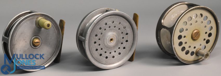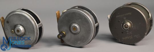 3x Various Alloy fly reels - features a M.C. Thorburn maker Edinburgh 3 ½" dia narrow drum alloy fly reel with crazed white handle, smooth brass foot, Malloch of Perth 3 ½" alloy fly reel by Dingley with rim tensioner, fracture to front rim, internally stamped 'D2', and a Sharpe's Aberdeen The Gordon 3 ½" fly reel retaining some original finish