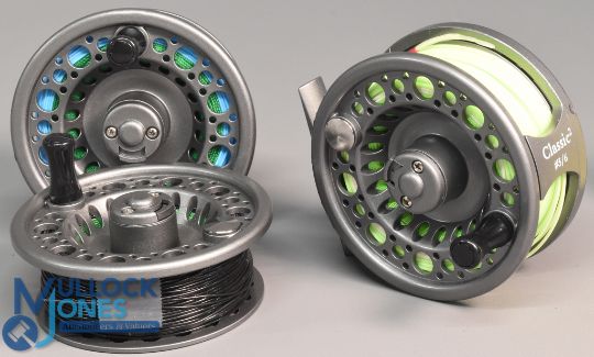 Snowbee Classic 5/6 fly reel and 2x spare spools in grey finish, with counter balance, rear drag adjuster, light signs of use, all loaded with line (3)
