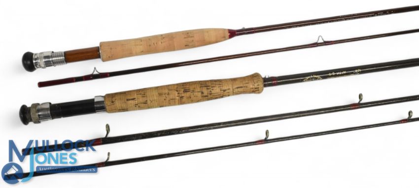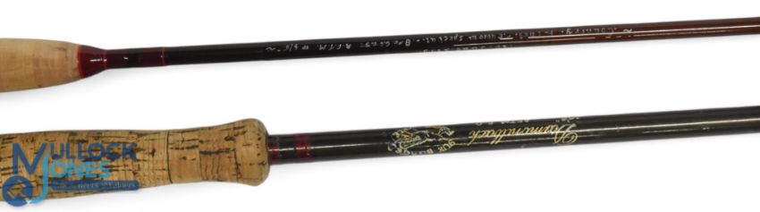 A custom built Country Lines Special carbon trout fly rod, 8ft 2pc, line 4/5#, alloy up locking reel seat with wood insert, lined butt/tip rings, cloth bag and alloy tube with push cap. Rod looks unused, presented to owner - details on rod. Sue Burgess Diamond Back carbon trout fly rod, 10ft 6" 2pc, line 6/9#, alloy reel seat (loss to locking nut), MCB and alloy screw top tube. (2)