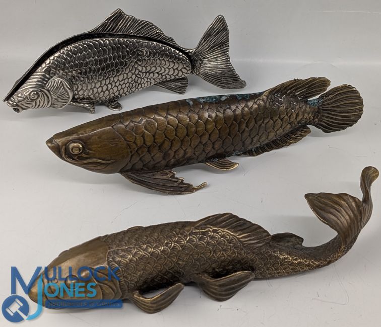 2x Oriental Bronze Cast Fish and a Silverplated Fish Letter Rack (3)