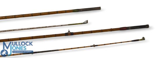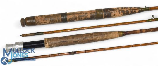 Hardy Alnwick "The Perfection" Palakona split cane trout fly rod E41927, 8ft 6" 2pc, alloy uplocking reel seat, agate butt/tip rings, no bag, needs attention. Unnamed split cane trout fly rod 8ft 2pc, brass sliding reel fittings and collars, lined butt/tip rings, cloth bag. (2)